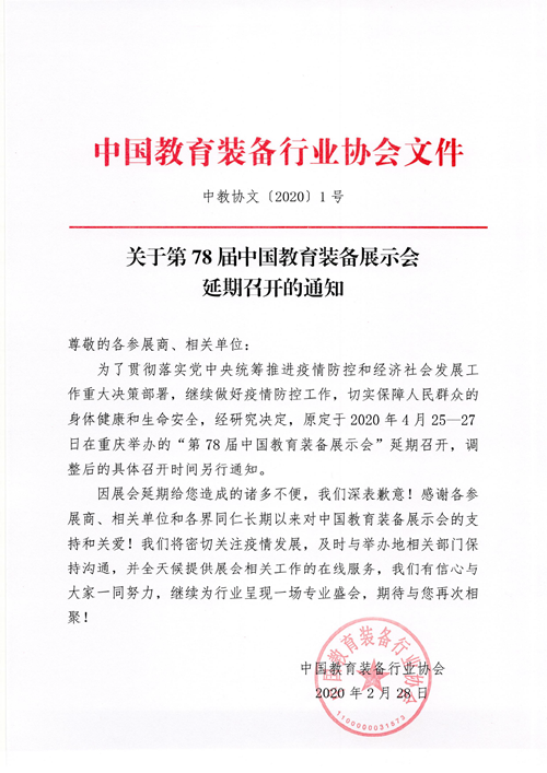 為了貫徹落實黨中央統籌推進疫情防控和經濟社會發展工作重大決策部署,繼續做好疫情防控工作,切實保障人民群眾的身體健康和生命安全,經研究決定,原定于2020年4月25—27日在重慶舉辦的“第78屆中國教育裝備展示會”延期召開,調整后的具體召開時間另行通知。